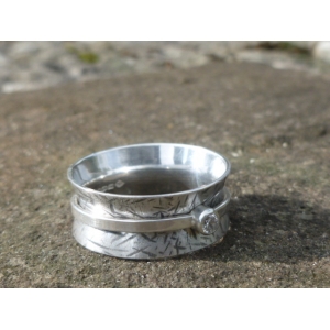 Textured and oxidised silver spinner ring. Inner ring set with 3mm white cubic zirconia on plain flat band. Hallmarked.