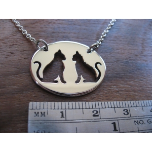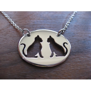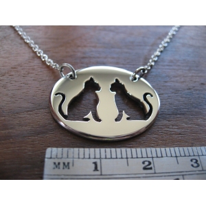 A handmade silver cat pendant. The oval is made from a piece of 1.2mm thick argentium silver, it is approximately 2.5cm wide. The two cats are hand cut using a jeweller's sat, and then the pendant can have a polished or satin finish.