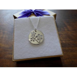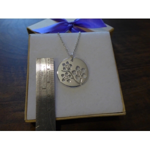 A handmade silver forget me not pendant. It is made from a 2.5cm wide argentium silver circle that is approximately 1.2mm thick.