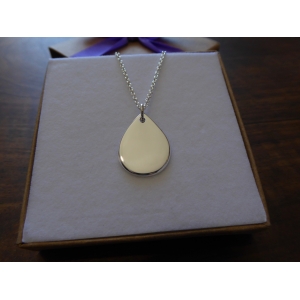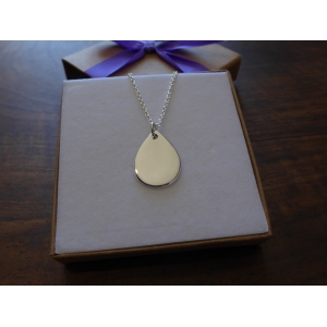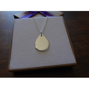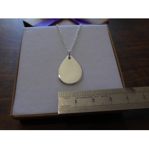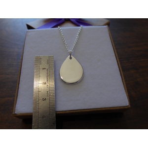 A silver rain drop pendant. It is hand cut from a piece of 1.2mm thick silver, and given a bright polish or satin finish