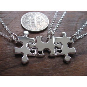 Three silver puzzle charms, each with a hand cut heart. Each puzzle is handmade from 1.2mm thick sterling silver, they are made to fit each other, and each has a bright polished finish or a satin finish, a satin finish is bright and shiny but has a textured look and is great if you want to avoid fine lines and scratches over time.