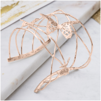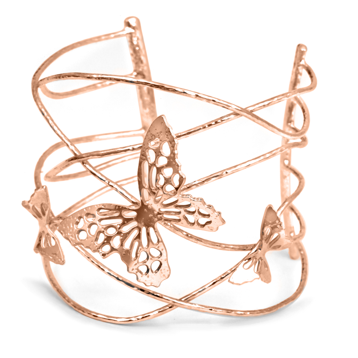 The Rose Gold Butterfly Cuff features multiple textured sterling silver wires crossing around the wrist with three sterling silver butterflies.