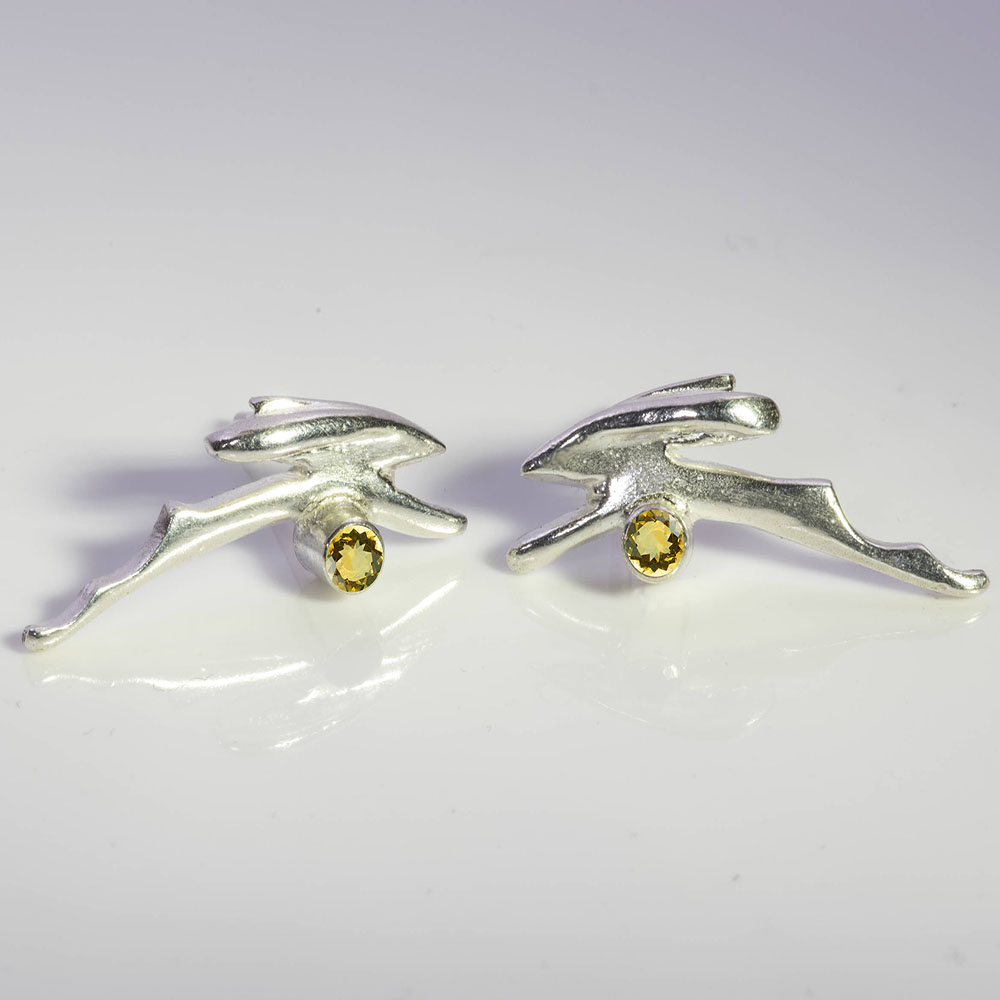 Sterling Silver leaping hare studs set with faceted golden yellow citrines