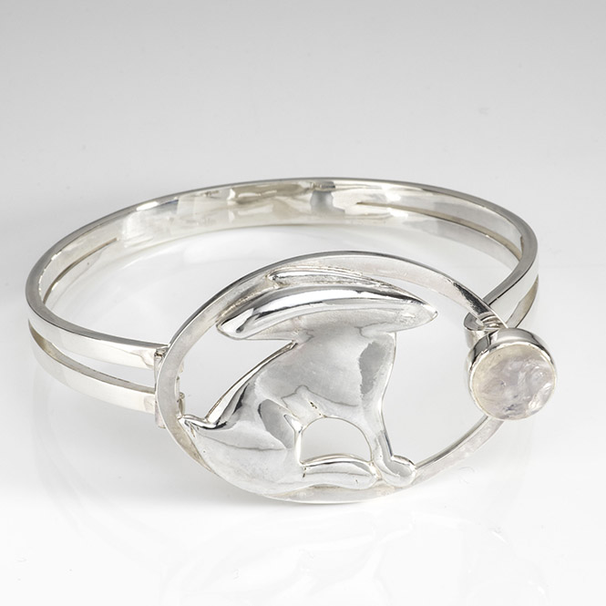 A unique and one off sterling silver Hare bangle adorned with a moonstone carved with the alluring charismatic face of the man-in-the-moon.