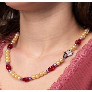 This necklace is a stylish piece, featuring a combination of 8mm cream shell pearls, 6mm lavender glass pearls and 10x4mm red glass nuggets for a striking splash of colour.