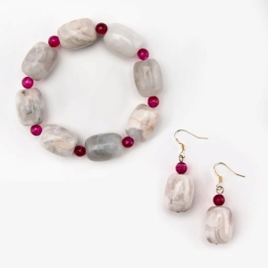 A stunning combination of light grey, white creamy barrel shaped marble beads dressed with 3-4mm rosy red round faceted glass beads add a nice pop of colour and glam that create a unique look.