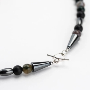 The hematite cones and rice beads held together with a sterling silver components and toggle clasp is perfect for men who want a striking design, and this necklace is sure to make a bold statement for any man.