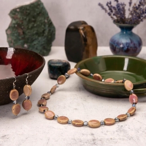 The pinkish tan colour and 8mm aura glass bead adds a touch of warmth and femininity, making this necklace a versatile choice for various occasions.