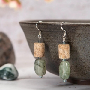 Give your jewellery collection an upgrade with our Prehnite Epidote and Jasper Earrings, featuring barrel-shaped green prehnite bead (approx 15mm x 10mm) with black/brown inclusions of epidote paired with creamy beige cylinder jasper bead (14mm x 10mm) for a sophisticated look.