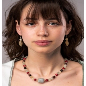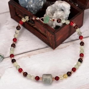 This eye-catching semi precious necklace/choker features a large light green jade barrel bead, faceted 5mm glass rondelles, 8mm tigers eye, green prehnite and red coral beads to add contrasted accents.