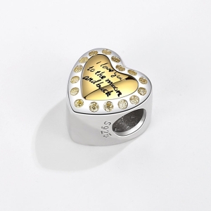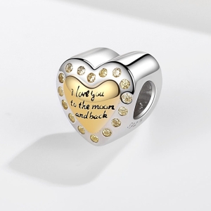 A beautifully worded ashes heart charm bead engraved with the saying 'I love you to the moon and back'. This heart charm is sterling silver with a gold plated heart centre and is surrounded with tiny very light clear - yellow crystals.