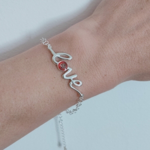 Our stunning love statement memorial ashes bracelet is beautiful and bold. The word Love has been expertly carved in scroll and the letter O will be carefully crafted to hold ashes or hair from your loved one inside.