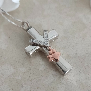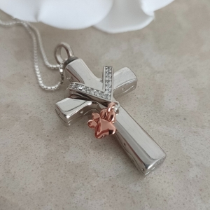 A stunning memorial ashes self fill cross pendant with dainty rose gold plated paw dangle charm and V shaped crystal design. This memorial necklace can hold a tiny quantity of ashes inside the top section of the urn pendant.