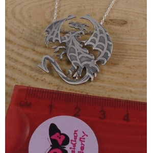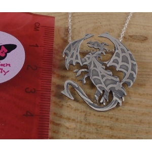 An intricate dragon necklace, hand made from sterling silver. The shape of the dragon has been hand pierced from a sheet of sterling silver. The details and pattern have then been hand drawn and etched. Two loops have then been soldered to the back for the chain, and the necklace has been oxidised to blacken the etched details.