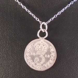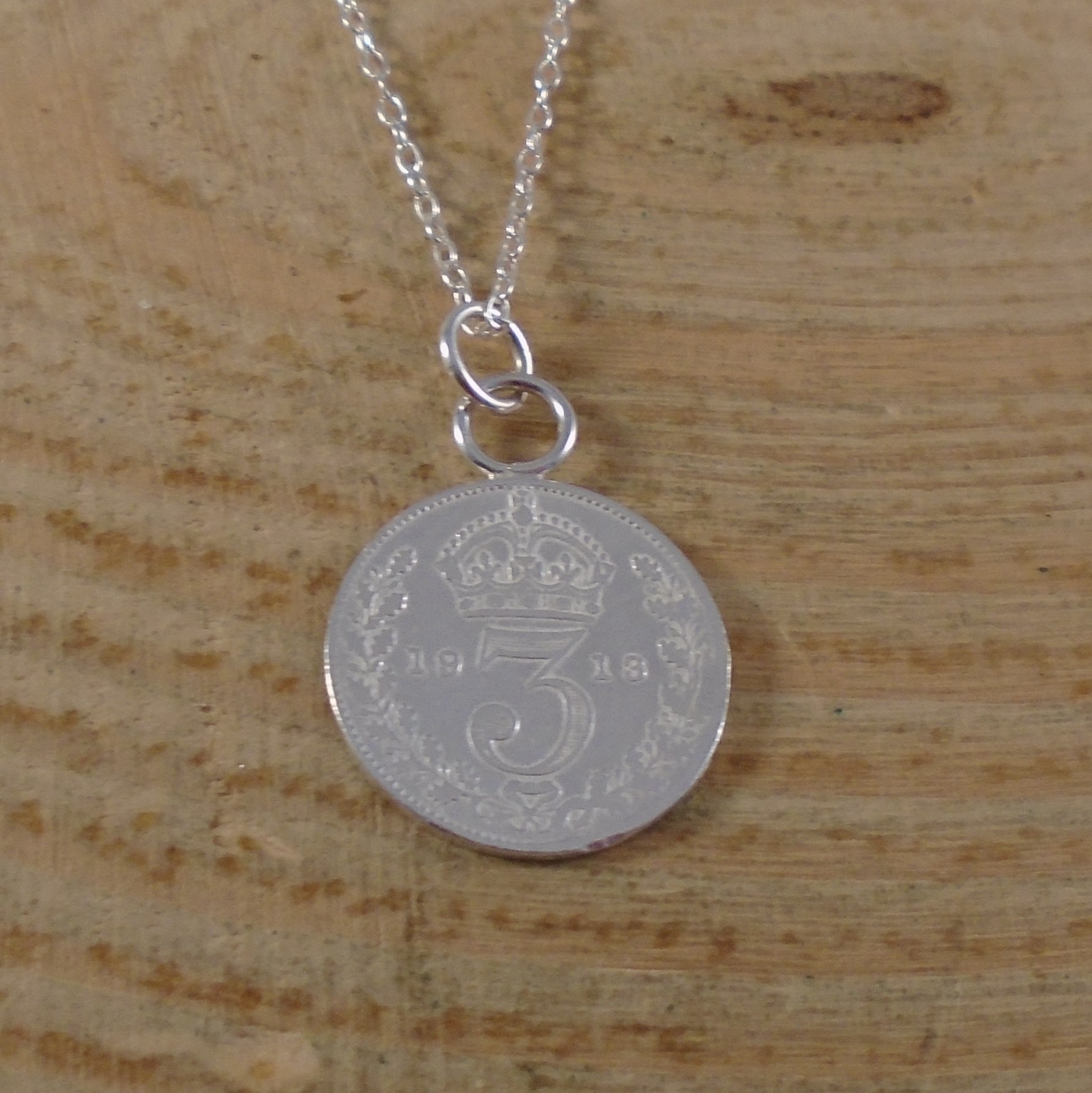 A simple, yet quirky necklace, featuring an old sterling silver threepence coin that is over 100 years old! A loop has been hand made from sterling silver and soldered to the top of the silver threepence from 1913. A sterling silver loop for the chain has then been added to the top.