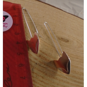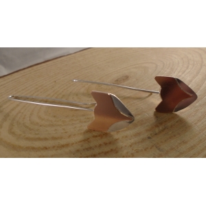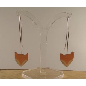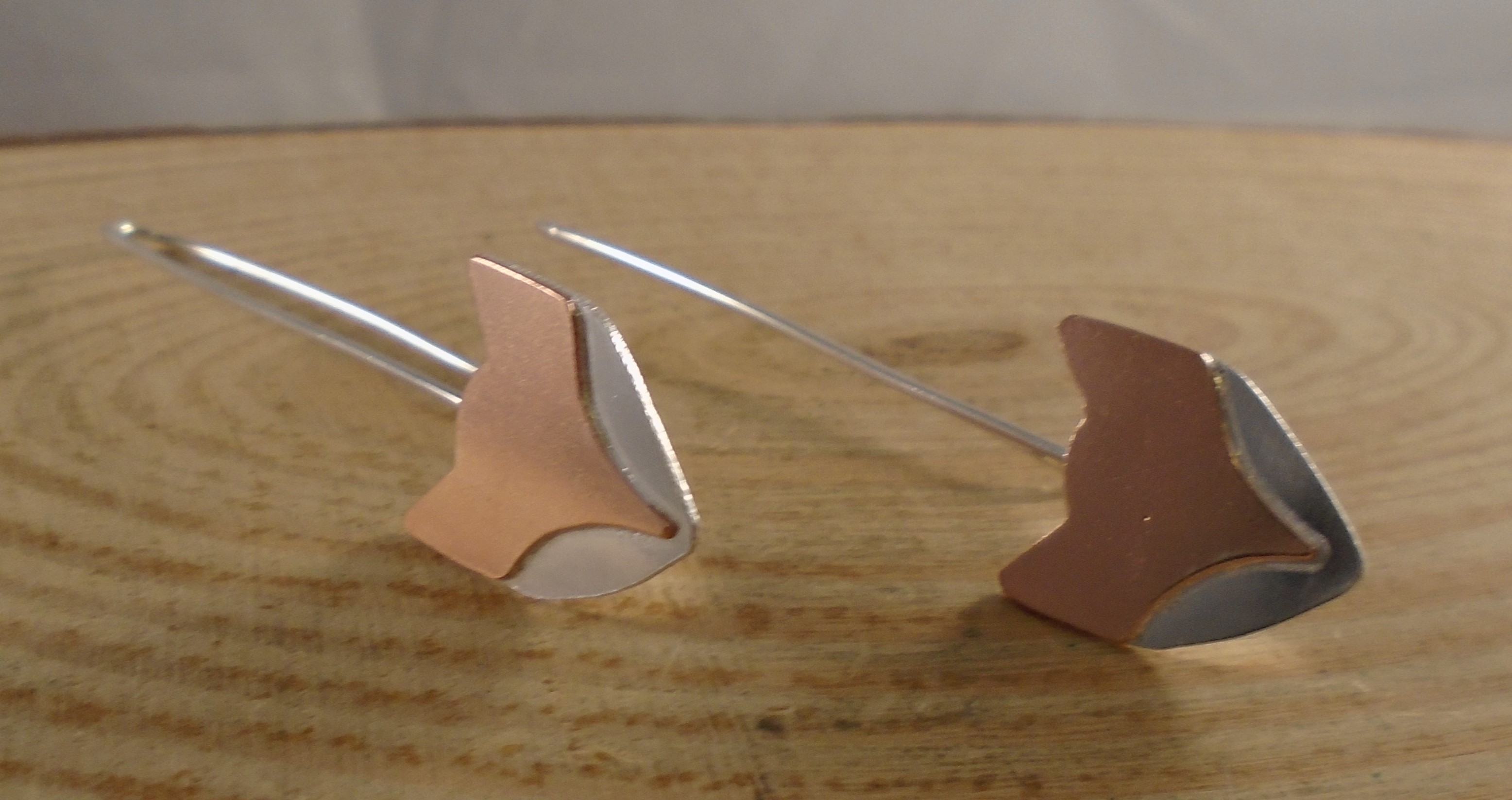 Simple and unusual fox earrings, hand made from sterling silver and copper. The shape of the fox head has been hand pierced from a sheet of sterling silver. The fur accents have been hand pierced from copper and soldered on. A long sterling silver ear wire has been hand made and soldered to the back of the fox head.