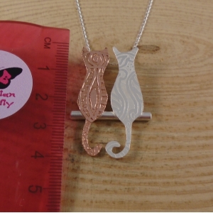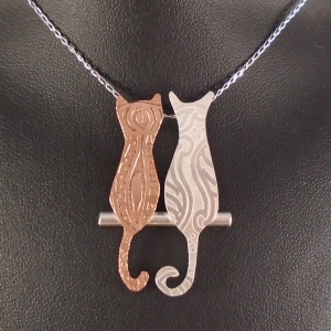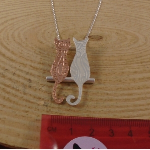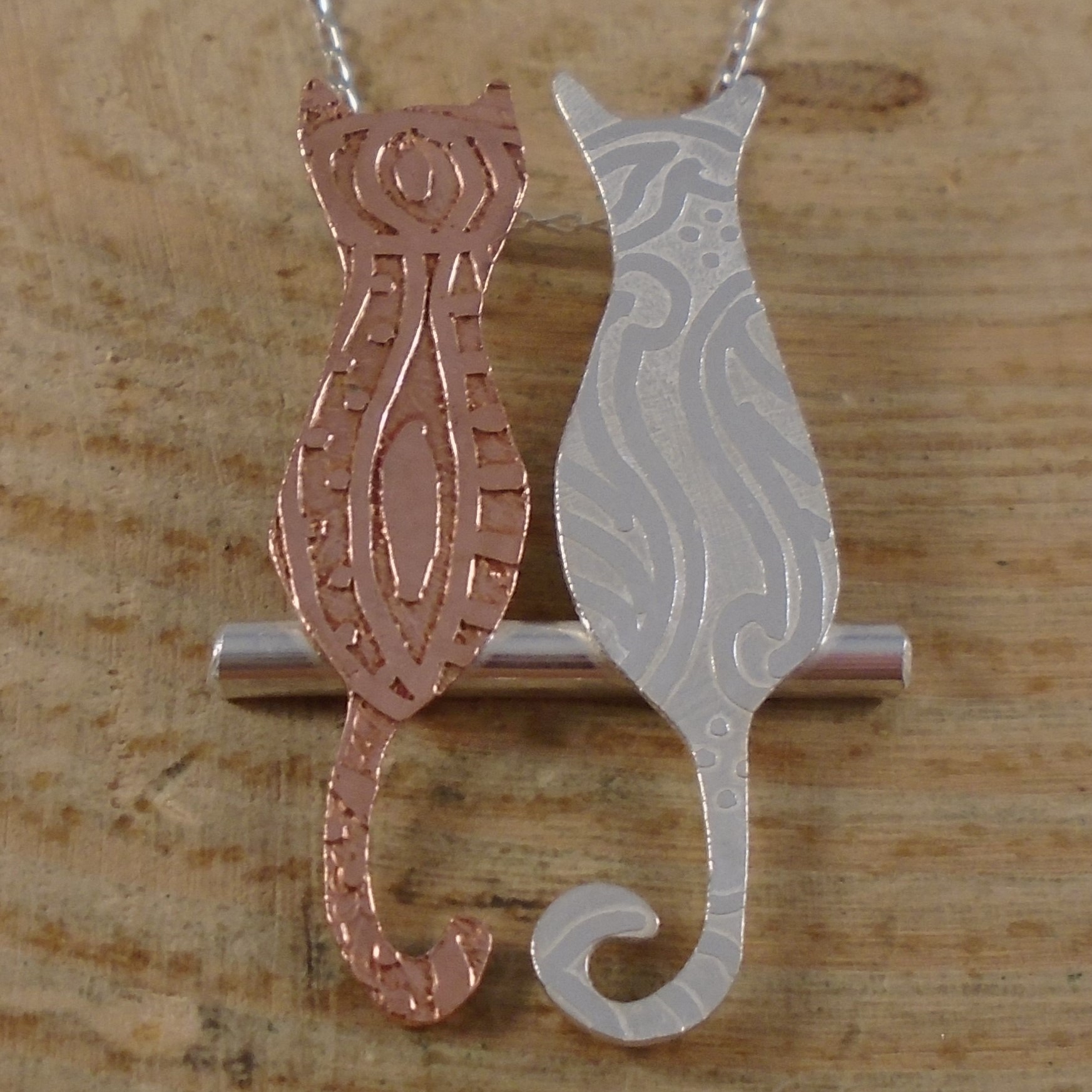 A pretty and unusual necklace, hand made from sheets of sterling silver and copper. The shape of a cat has been hand pierced from a sheet of silver and copper. They hav then been hand drawn with zentangle patterns and etched. A ledge has been hand made from sterling silver wire, and the cats soldered on. Two loops have then been soldered to the back for the chain.