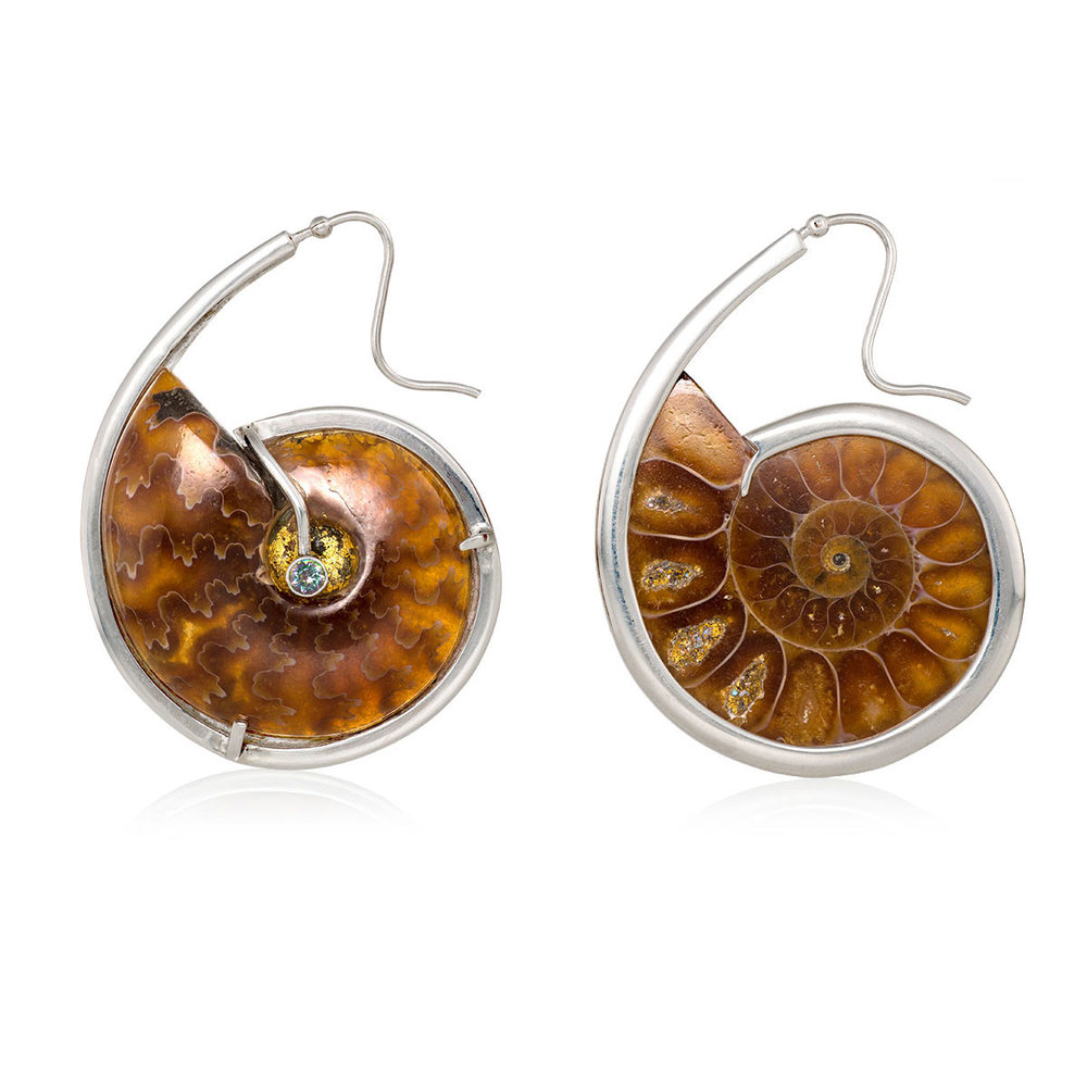 Serendipitous play brought about these earrings. Cradled in a sleek framework of sterling silver, these hand carved and polished Ammonite effortlessly show of their translucent beauty as the centre piece for these statement earrings; echoing the timelessness of their origin.