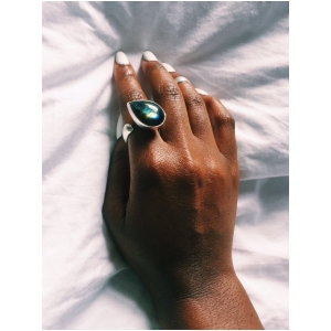 Handcrafted 'Monumental Miniature' statement ring in sculpted silver set with an iridescent Labradorite cabochon. The shank of the ring has a flat base which lends itself to the ring standing upright when not worn. Its open design supports the egg-shaped bezel cup containing the gem with sure ease.